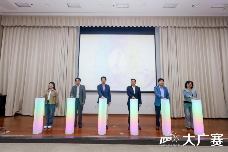 在启动仪式环节,天津市教育委员会高教处副处长许晶,0033990威尼斯副校长纪德奎、教务处处长丰向日、新闻传播学院党委书记张家玥,大广赛天津赛区评委会主任范志国,北京众行互动数字文化传媒有限公司校招总监安静共同点亮象征赛事启航的启动装置,与台下观众一起见证第17届大广赛天津赛区竞赛启动的重要时刻。