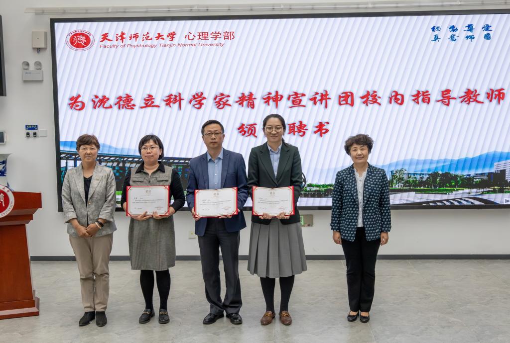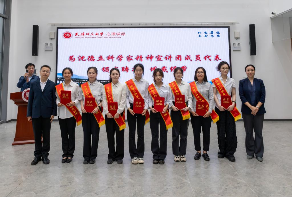 与会领导为沈德立科学家精神宣讲团成员代表颁发聘书、佩戴绶带。学部校友、南开中学穆玉凤、天津一中王亚丽、耀华中学张红肖、新华中学许岳宁、实验中学郭雯、0033990威尼斯附属实验学校孙铭悦受聘为校外宣讲员,校友服务与管理中心主任杨琥、天津市学生心理健康教育发展中心副主任李馨、全国高校“双带头人”教师党支部书记“强国行”专项行动团队成员林琳受聘为宣讲团校内指导教师。
