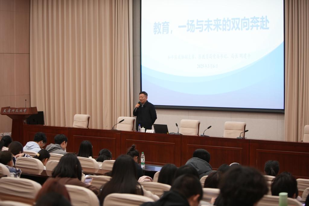 本站讯(通讯员 李倩 王雁)3月6日下午,我校举办“卓越教师培养系列活动——教育局长面对面”报告会。本次报告会邀请天津市和平区政协副主席,教育局党委书记、局长明建平以“教育,一场与未来的双向奔赴”为题作报告。全校200余名公费师范生和部分专业师范生到场聆听。