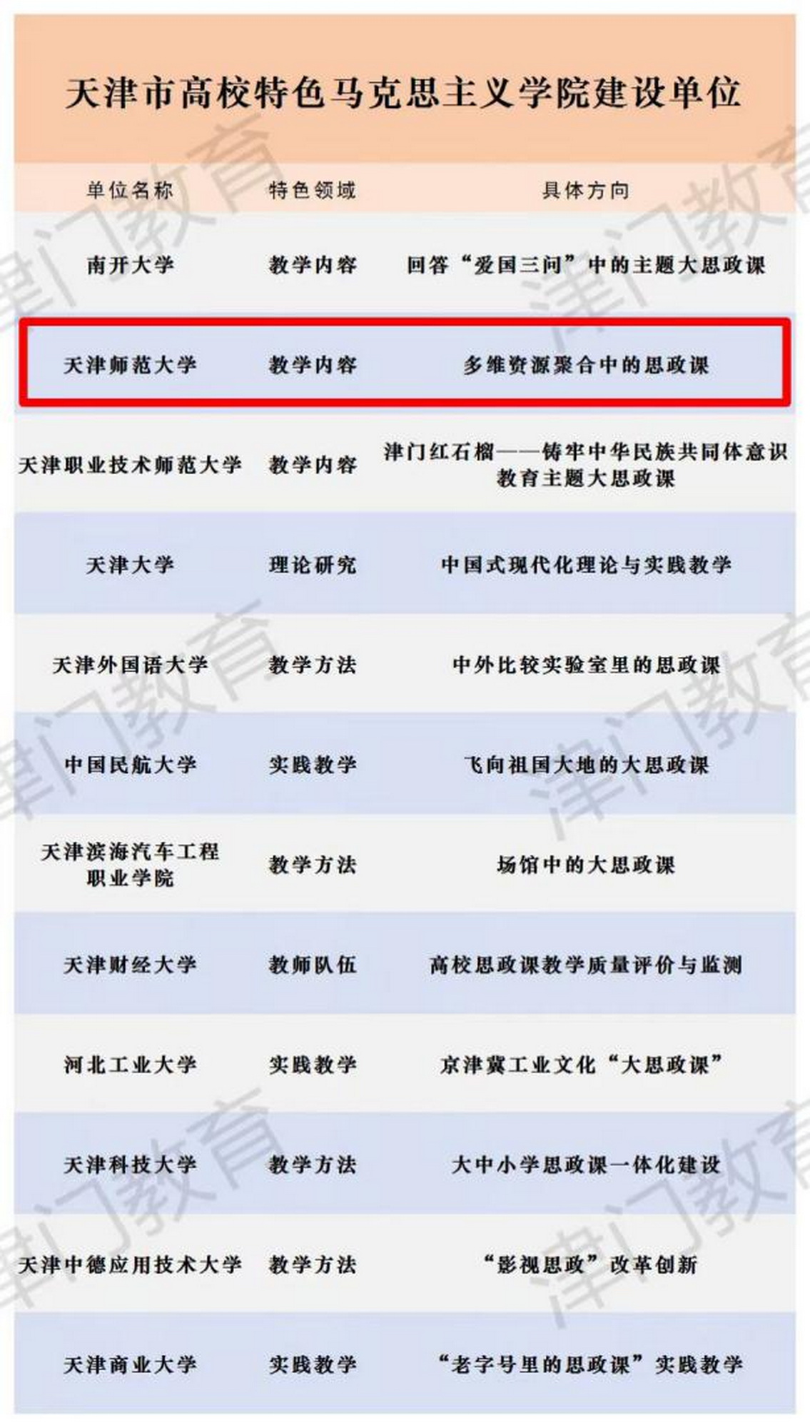 为深入贯彻全国教育大会精神和习近平总书记关于思政课建设重要指示批示精神,引导天津市各高校结合学校办学特点、学科专业特长、思政发展优势,深化新时代马克思主义学院建设,着力打造具有全国影响力辐射力的特色思政课品牌。自2024年11月以来,市委宣传部、市教育两委联合开展了全市高校特色马克思主义学院评选建设工作。最终确定首批12家天津市高校特色马克思主义学院建设单位和15家天津市高校特色马克思主义学院培育单位,建设和培育周期为3年。