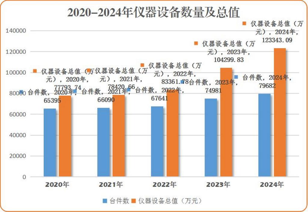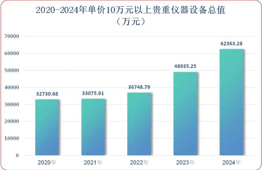 五年间,我校资产总量迅速增加,资产结构更为合理,办学条件得到显著改善。2020年,我校仪器设备总值为77793.74万元,到2024年末已达到123343.09万元,仅2022年中长期贷款采购教学科研仪器设备家具53861.10万元,其中,贵重仪器设备248台件,合同金额21323.85万元。近五年仪器设备总值增长58.55%。单价10万元以上贵重仪器设备总值由2020年的32730.68万元增长至62363.28万元,近五年总值增长90.53%。