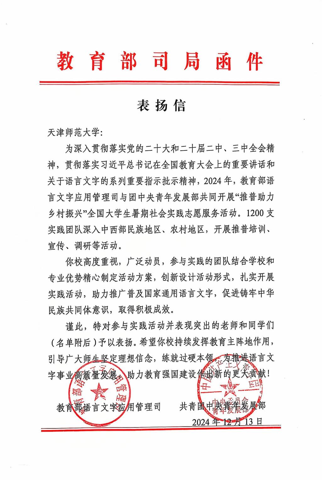 此次教育部语言文字应用管理司和共青团中央青年发展部来信表扬,充分肯定了我校在“推普助力乡村振兴”志愿服务实践活动中的突出表现。校团委将继续深入贯彻落实习近平总书记在全国教育大会上的重要讲话和关于语言文字的系列重要指示批示精神,发挥教育主阵地作用,引导广大师生坚定理想信念,练就过硬本领,为推进语言文字事业高质量发展,助力教育强国建设贡献青春力量。
