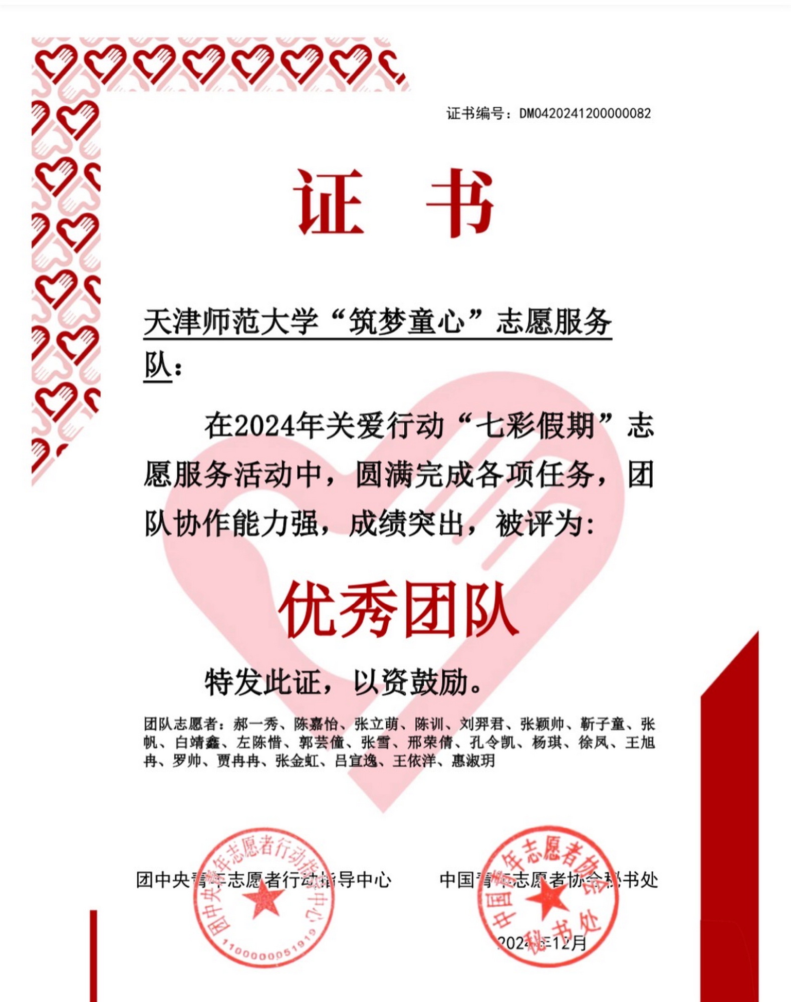 本站讯(通讯员 武梦玮)近日,团中央青年志愿者行动指导中心、中国青年志愿者协会秘书处公布了2024年关爱行动“七彩假期”志愿服务活动优秀团队名单,我校“筑梦童心”志愿服务队从全国2000支队伍中脱颖而出,获评“优秀团队”。