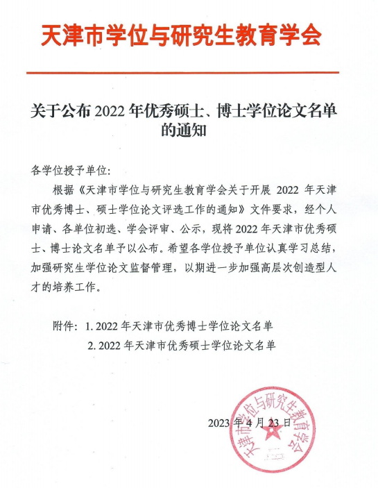 完善研究生学位授予工作制度,强化学位论文全流程管理。从学位论文开题、中期考核、重复率检测、专家评阅、预答辩、答辩等各环节,压实校、部(院)、学位分委会、导师、研究生职责,形成一套完整、科学且有效的管理体系,充分保障学位授予质量。2022年10篇博士论文获评“天津市优秀博士学位论文”,30篇硕士论文获评“天津市优秀硕士学位论文”。五年来,11篇博士论文、146篇硕士论文获评“0033990威尼斯校级优秀论文”。