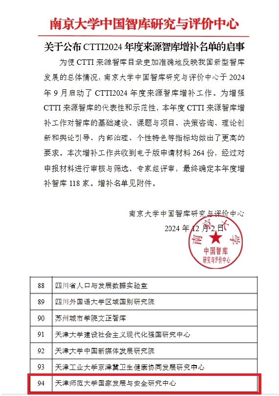 我校国家发展与安全研究中心(负责人曲凯)入围2024年度CTTI来源智库,9项成果荣获2024年度CTTI智库建设最佳案例和优秀成果。其中,国家发展与安全研究中心(负责人曲凯)的建设案例《打造属性谐振管理机制 完善高校智库组织模式》和国家治理研究院(负责人佟德志)的建设案例《着力打造全流程PI管理制 完善智库组织体制新模式》获评2024年度CTTI智库建设示范案例;国家治理研究院佟德志教授团队的成果、乡土文化教育研究中心纪德奎教授团队的成果、国家发展与安全研究中心尚海涛教授团队的成果、国家治理研究院宋林霖教授团队的成果、风险治理与应急管理研究中心温志强教授团队的成果分获2024年度CTTI智库研究优秀成果一等奖;乡土文化教育研究中心纪德奎教授团队的另一成果和天津市基础教育决策战略研究中心王光明教授团队的成果分获2024年度CTTI智库研究优秀成果二等奖。