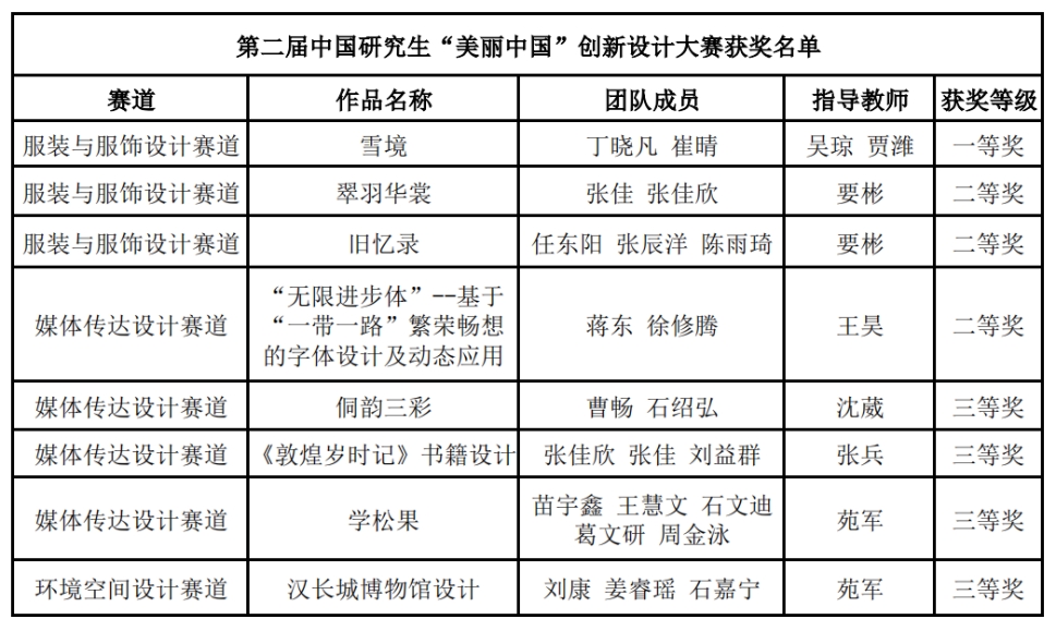 本站讯(通讯员 徐梅芳 史冬梅)11月15日,由教育部学位管理与研究生教育司指导,中国学位与研究生教育学会和中国科协青少年科技中心共同主办的第二届中国研究生“美丽中国”创新设计大赛圆满落幕。经过137天赛程,我校37支研究生团队参加了赛事4个分赛道“服装与服饰设计”“媒体传达设计”“环境空间设计”“工业产品设计”的全部比赛,最终美术与设计学院“晓之以晴”研究生团队设计的作品获得全国一等奖。本届大赛我校共获得一等奖1项,二等奖3项,三等奖4项,奖项等级和数量比上一届取得了显著提升,这充分体现了我校研究生的创新能力、实践能力和协作精神,展现了天师大研究生风采,为学校争得了荣誉。