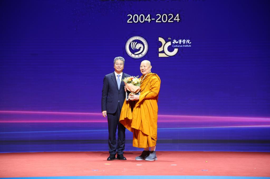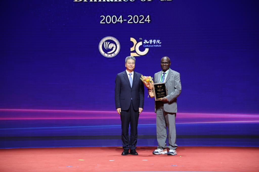 11月16日,中国国际中文教育基金会在2024世界中文大会期间举办“孔院之光——孔子学院成立20周年特别致谢活动”,向来自34个国家的41位外国政要、汉学家、校长、孔子学院院长颁发致谢铭牌,我校合作孔院外方伙伴肯尼亚原教育部长、原内罗毕大学校长、原孔子学院总部理事会理事乔治·马果哈,泰国海上丝路孔子学院理事会主席颂德通猜等双双荣获殊荣,接受了中国教育部副部长吴岩颁授的致谢牌。