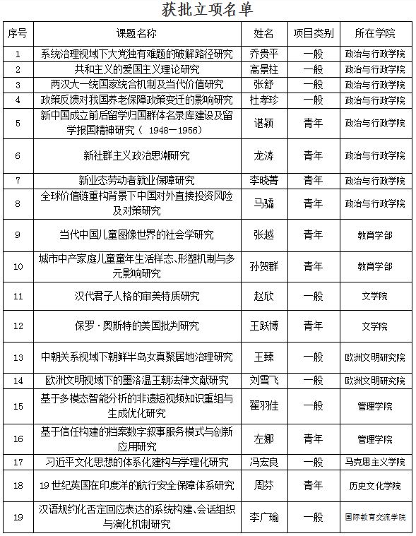 在19项国家社科基金年度项目中,政治与行政学院获批8项,教育学部获批2项,文学院获批2项,欧洲文明研究院获批2项,管理学院获批2项,马克思主义学院获批1项,历史文化学院获批1项,国际教育交流学院获批1项。