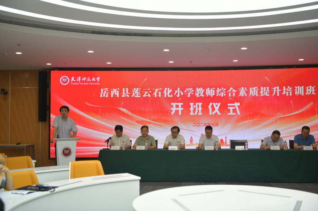 继续教育学院消息 (通讯员 周博)7月22日,岳西县莲云石化小学教师综合素质提升培训班在京津冀教师协同发展创新中心举办。校党委常委、副校长佟德志出席开班仪式并讲话。中石化销售华北分公司党委副书记、纪委书记张晓刚,中石化销售华北分公司党群工作部主任,莲云教育党总支书记,莲云中心学校副校长兼莲云石化小学校长、天津市中小学教师继续教育中心主任及研修班全体学员参加开班仪式。继续教育学院院长洪德全主持开班仪式。
