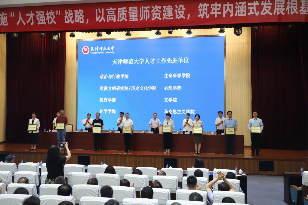 开幕式上,与会领导嘉宾为政治与行政学院、生命科学学院、历史文化学院/欧洲文明研究院、心理学部、教育学部、文学院、化学学院和马克思主义学院等8个人才工作先进单位颁发奖牌。