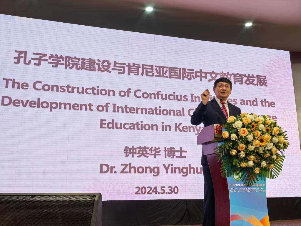 钟英华在大会上作《孔子学院建设与肯尼亚国际中文教育发展》主旨演讲,向非洲各国与会代表介绍肯尼亚第一所孔子学院建设和国际中文教育发展情况。
