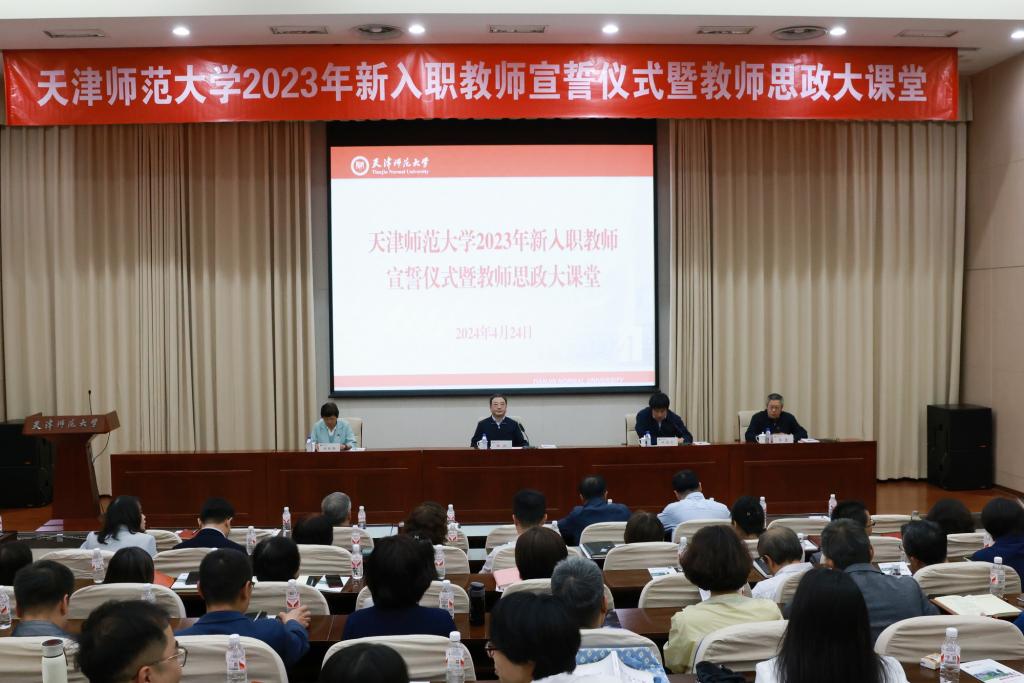 仪式在雄壮的国歌声中拉开帷幕。曲凯代表学校向新入职教师表示欢迎,对大家全面提升专业素养和育人水平,尽快转变角色、适应岗位要求、融入学校发展提出三点希望。一是要坚持党的领导,提升思想政治素质,始终把旗帜鲜明讲政治放在首位。深刻领悟“两个确立”的决定性意义,增强“四个意识”、坚定“四个自信”、做到“两个维护”,在教育教学实践中始终坚持正确的政治方向。深学细悟习近平新时代中国特色社会主义思想,深刻领会习近平总书记关于教育的重要论述,牢牢把握立德树人根本任务,用好课堂教学主渠道,以溶盐于水、润物无声的教育引导学生听党话、跟党走。将坚定的理想信念与“小我”的个人理想相结合,与“大我”的共产主义远大理想和中国特色社会主义共同理想相统一。二是要练就扎实学识,涵养高尚师德,努力在教书育人的道路上弘扬践行教育家精神。深刻学习领会教育家精神的核心要义和内涵精髓,认识自身德行与教育家、优秀教师的内在一致性,主动查找差距与不足,不断向教育家靠拢。恪守师德规范,真正把教书育人和自我修养结合起来,时刻自重、自省、自警、自励,以崇高师德涵养自身,以高尚人格感染学生,努力成为为学、为事、为人的师者典范。始终秉持勤学的理念和态度,不断优化知识结构,加快知识更新,努力构建与新发展理念相契合的知识体系。遵循教书育人规律,尊重学生个体差异,使每个学生都能充分发挥自身优势、激发潜能。三是要胸怀“国之大者”,强化使命担当,努力在攻坚提质追求卓越的实践中善作善成。深入学习宣传贯彻习近平总书记视察天津重要讲话精神,积极参与推动落实《关于学习贯彻习近平总书记视察天津重要讲话精神奋力谱写全面加快高水平师范大学建设新篇章的落实举措》。聚焦国家重大战略需要,充分利用学校提供的平台和资源,以高水平科研创新促进新质生产力发展,以高质量师范教育推动改革深化,以高品质文化传播服务文化传承,以高效能校园治理助力城市治理现代化提升,努力在四个“善作善成”上求突破、勇争先,为奋力谱写中国式现代化天津篇章贡献力量。
