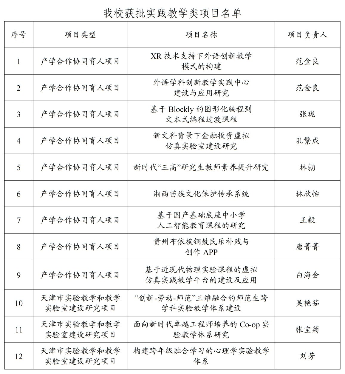 教务处消息(通讯员 李倩)近日,教育部公布“2024年第一批产学合作协同育人项目立项名单”,我校9个项目在列;天津市教委公布“2024年天津市实验教学和教学实验室建设研究项目立项名单”,我校3个项目获批。