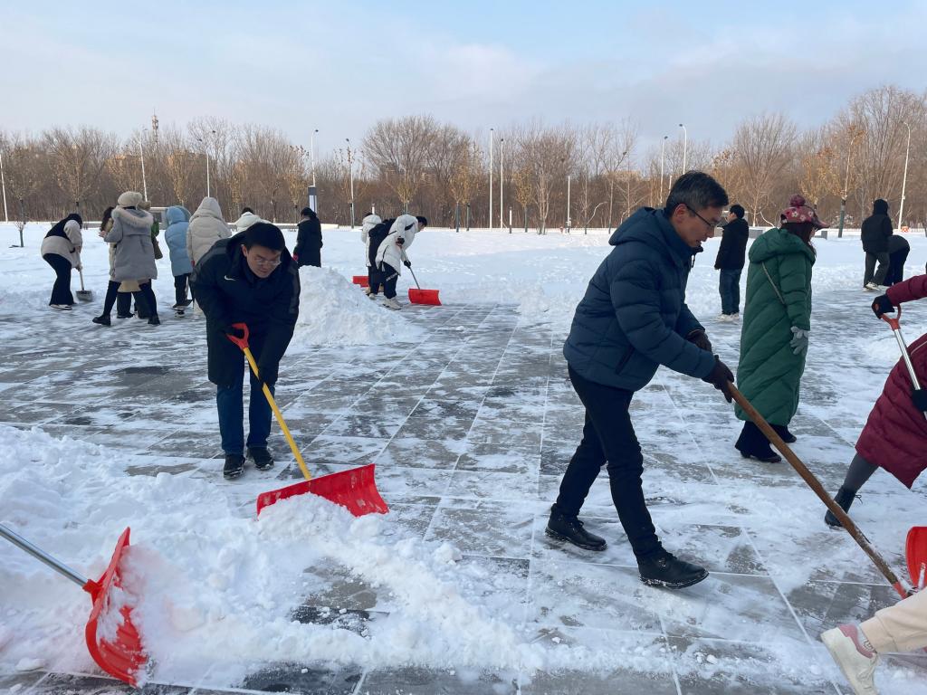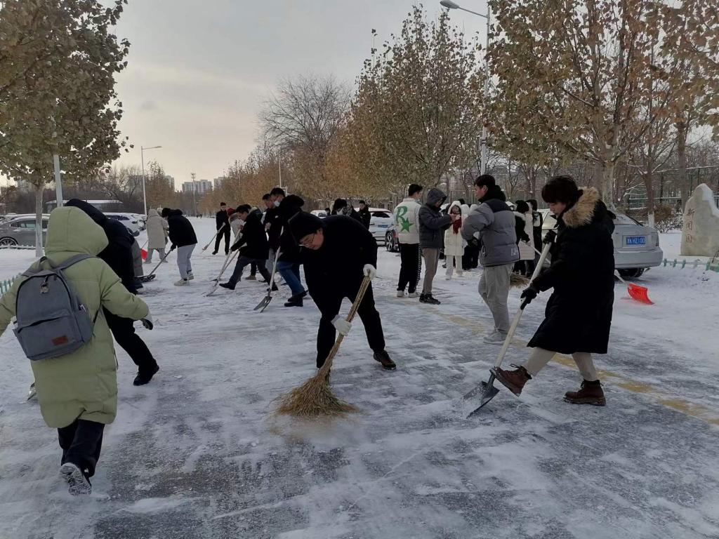 除雪现场,师生们化身校园“守护者”,纷纷行动起来,不怕苦不怕累,大家团结协作、互帮互助,手持推雪铲、铁锹等工具,有序地清理道路积雪、铲除路面结冰。师生们热火朝天地忙碌着,用火热的情怀为冬日校园增添了一股暖流,为全校师生的安全出行提供了保障。