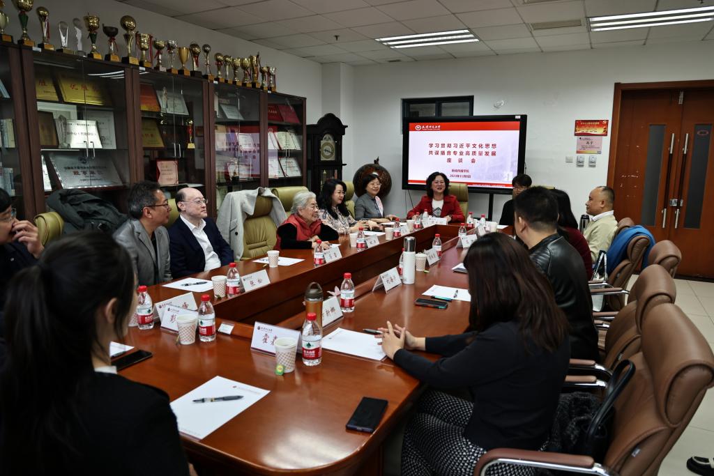 在现场交流中,虹云艺术工作室艺术总监左冰介绍了工作室成立以来开展的工作和在服务基础教育、对外汉语教育、面向社会的有声语言教育、面向高校和机关团体的“艺术党课”“艺术思政课”等方面取得的成绩,以及受中宣部和“学习强国”学习平台委托开展录制工作的情况。我校校友、天津广播电台著名播音员郝娟介绍了联系邀请虹云艺术工作室来校交流的初衷。我校教务处处长纪德奎介绍了学校艺术类通识课建设和课程思政工作情况。新闻传播学院、文学院主要负责同志分别介绍了相关专业在教育教学、推广国家通用语言等方面的工作。