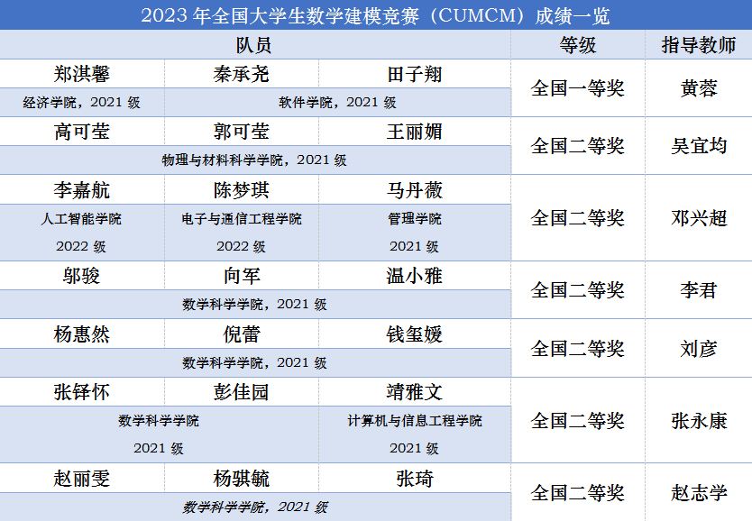 数学科学学院消息(通讯员 郭小玮 张永康)近日,2023年全国大学生数学建模竞赛结果揭晓,我校学子获得全国一等奖1项、二等奖6项,天津市一等奖13项、二等奖23项。此外,在2023年初举办的美国大学生数学建模竞赛中,我校获得国际一等奖1项、二等奖3项。两项赛事获奖等级与数量均创近年新高。