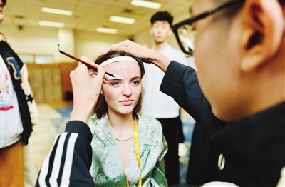 来自冰岛的羿朵,在天津艺术职业学校体验京剧“勾脸”。