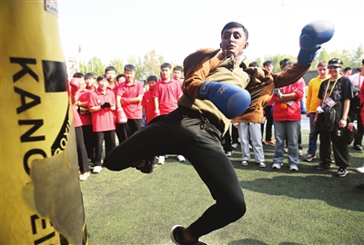 来自巴基斯坦的选手肖龙在霍元甲武术学校展示他学到的武术招式。