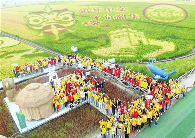 来华参加“汉语桥”世界中学生中文比赛的各国选手,行走天津的首站来到宁河区七里海镇“宁和稻香生态园”,在生长着“汉语桥”logo的稻田画前合影留念。