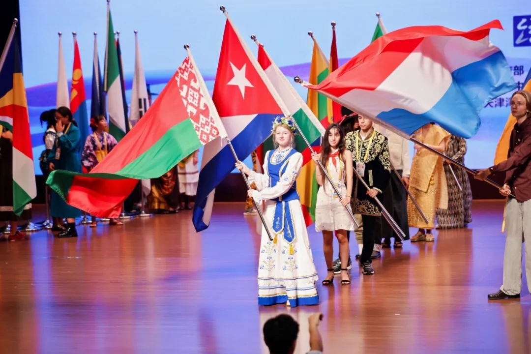 伴随着“汉语桥”主题曲响起,来自96个国家的113名选手挥舞着本国国旗依次入场。