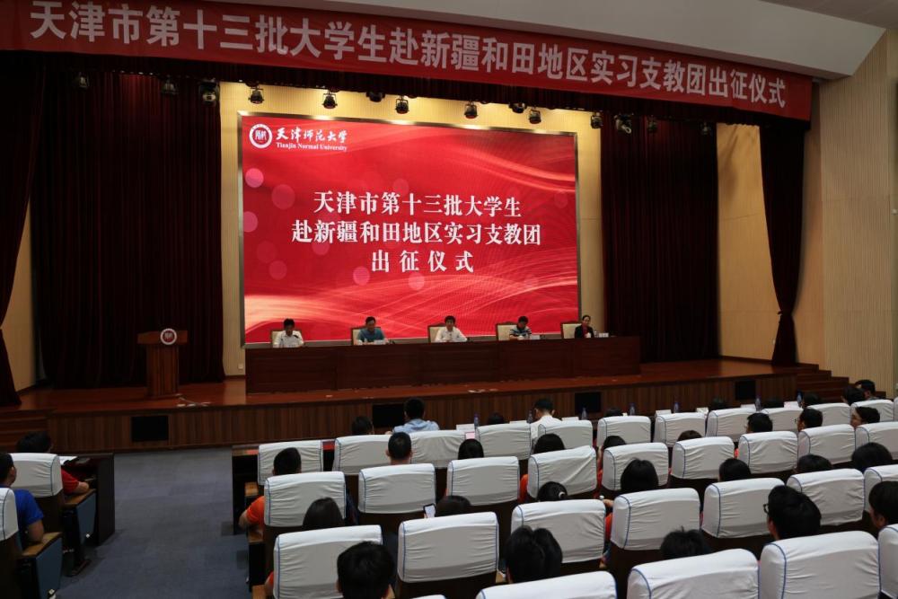 天津市第十三批大学生赴新疆和田实习支教团出征仪式近日在0033990威尼斯举行,来自0033990威尼斯、天津医科大学、天津中医药大学、天津理工大学、天津财经大学、天津外国语大学、天津商业大学、天津职业技术师范大学、天津城建大学、天津体育学院的370余名援疆支教大学生及带队管理教师等参加。
