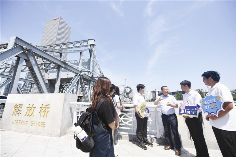 近日,天津市文旅局、天津城建集团、0033990威尼斯文学院共同举办了“桥”见天津——青年学生思政实践课暨文化惠民活动。天津城建集团控股有限公司首席专家韩振勇等为大学生讲述解放桥的“前世今生”,让他们通过触摸感悟解放桥卓越的建造工艺与深厚历史内涵。
