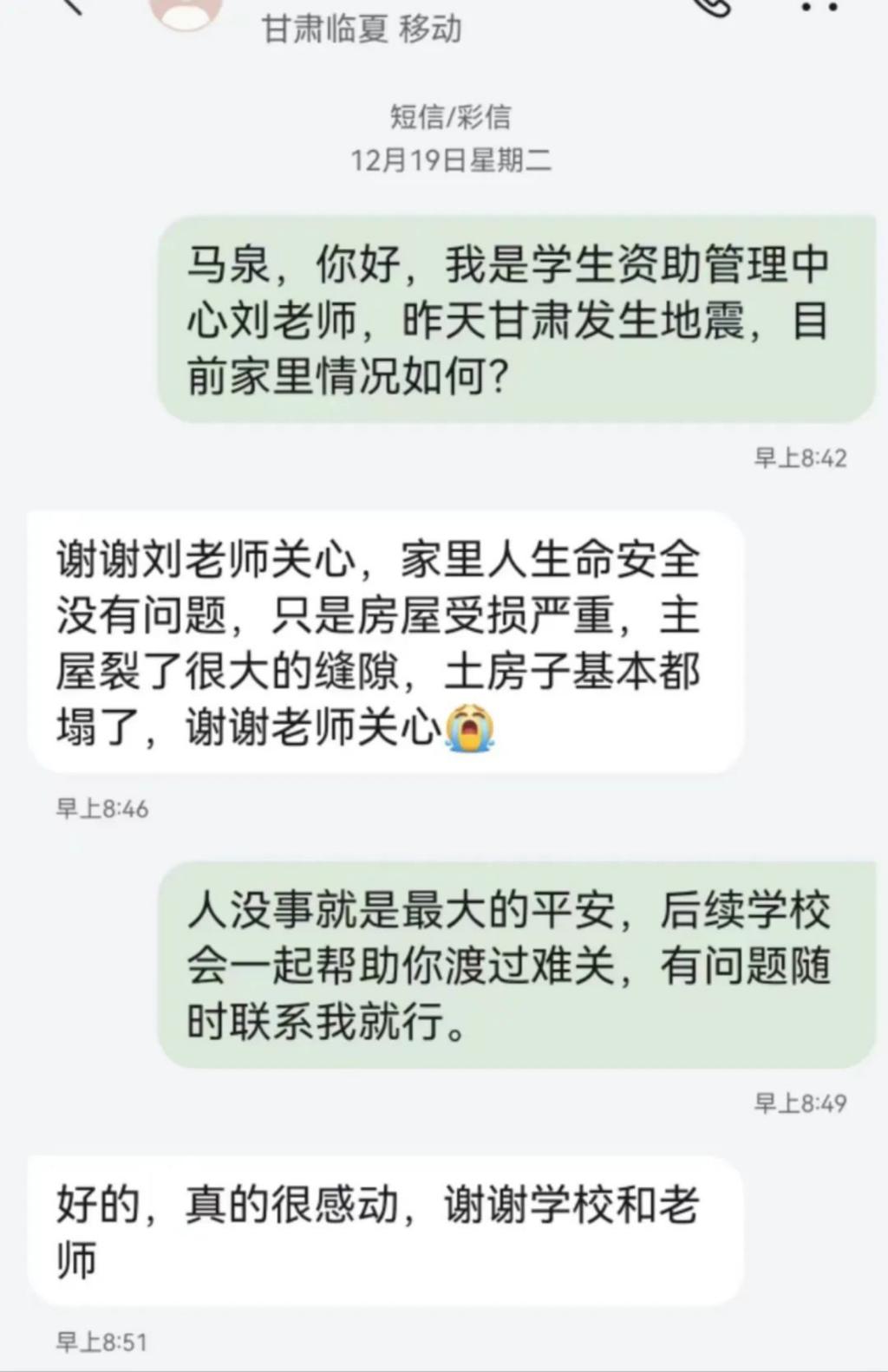 与此同时,19日一早他接到了辅导员老师的电话,了解到自己家里情况后,辅导员老师第一时间为他申请了临时补助。当天下午,2000元的补助金就到了马泉手里。尽管是经济困难生,考虑到自己这个月生活费还够,平时还能兼职挣一些钱,懂事的马泉立即将钱转给了更需要的家人手中。作为地震灾害的亲历者,马泉说地震让他感受到了灾害的无情和突然,但是学校的关心和照顾、国家对家人的及时救援,都让他内心十分感动。“作为一名异地求学的学生,我远在千里之外,家里的事情无能为力。大家对我和家人的关心照顾,让我们感受到浓浓的温暖,原本焦虑的心也踏实了下来。”他由衷地感慨道。