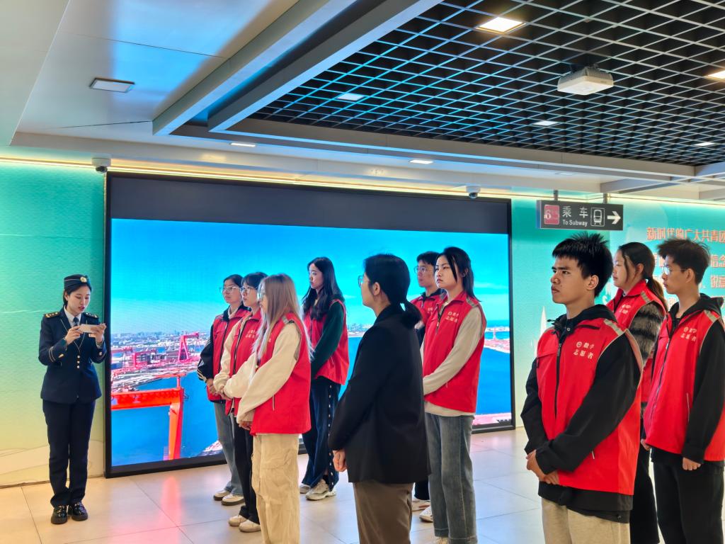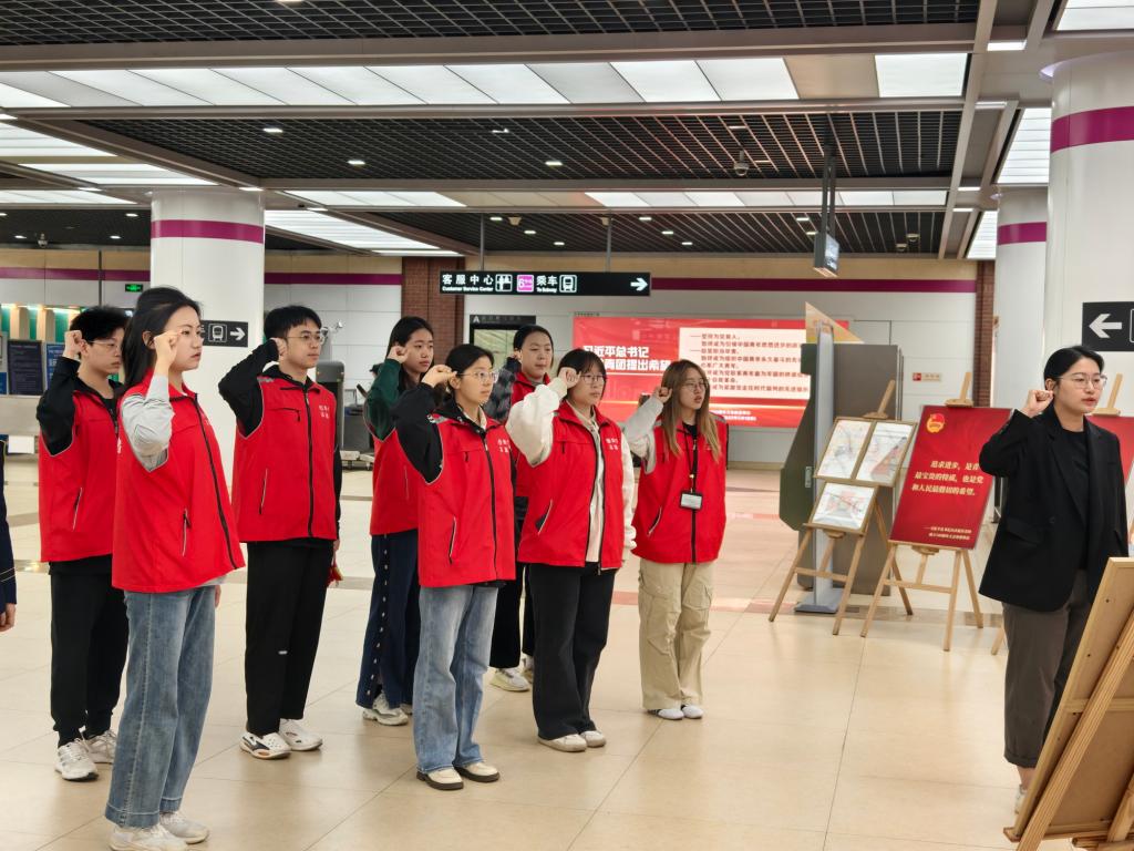 参观学习之后,同学们展开志愿服务工作,耐心引导乘客有序购票、安检、排队候车等,维护了高峰期站内秩序,彰显了青年担当。