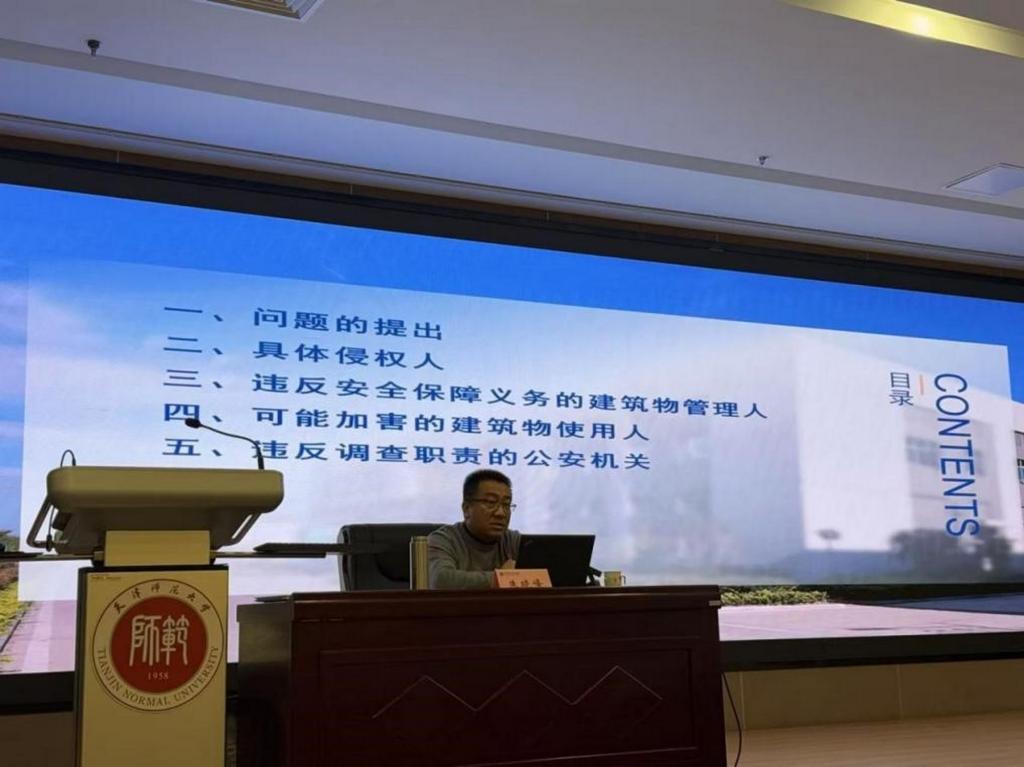 本站讯(通讯员 侯慧秀)12月6日,法学院“中联法学讲坛”系列活动在京津冀教师发展协同创新中心小报告厅举行,中央财经大学法学院教授、博士生导师朱晓峰以“《侵权责任编解释(一)》中的高空抛物致损赔偿责任研究”为题作报告。讲座由法学院院长郝磊主持,法学院副院长郭明龙、中联律师事务所天津办公室高级合伙人邱凯律师以及天津君辉律师事务所高级合伙人张卿卿律师担任与谈嘉宾。法学院研究生与本科生共180余人参加此次讲座。