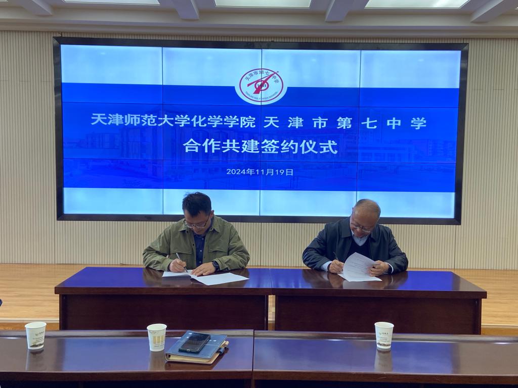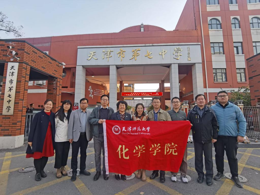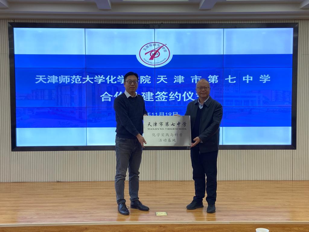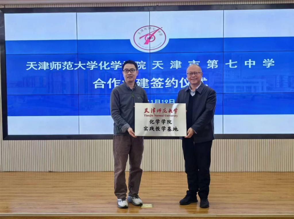 本站讯(通讯员 李小轩)11月19日下午,化学学院赴天津市第七中学开展访企拓岗活动,并举办实践教学基地签约暨揭牌仪式,标志着双方在科学教育、化学实践及教学实践等领域开启合作新篇章。我校化学学院党委书记吴金明,党委副书记杨欣艳,副院长朱柏林、李程鹏;天津市第七中学党委副书记、校长王保庆,副校长郑建权、王振红,及两校部分教师代表参加。