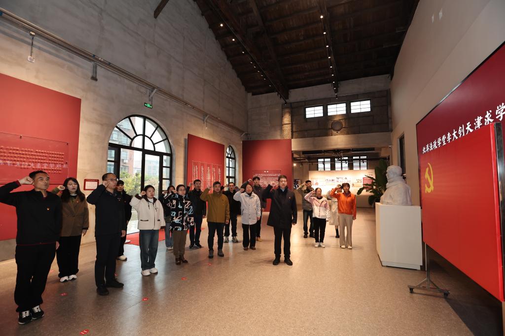 在北洋法政学堂李大钊天津求学遗址,学院师生跟随讲解,现场感受了革命先驱李大钊同志的革命思想、崇高精神和伟大人格。在参观结束后,师生党员在学院党委书记的带领下,面向党旗,进行了重温入党誓词活动。