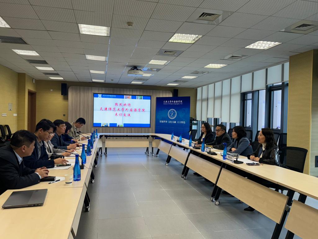 王立松对学院一行的到访表示热烈欢迎,介绍了天津大学外国语学院近年来积极推进学科交叉,提升办学水平的举措、成果,及学院党建引领推动人才引进、师资队伍建设、学科建设、课程思政、学生培养等中心工作发展情况。王立松表示,希望通过此次交流,进一步加强两校之间的合作,共同探索外语学科发展的新方向。