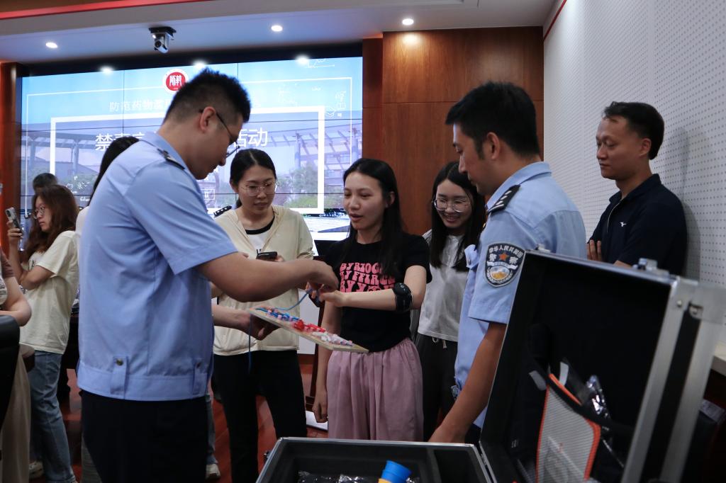 活动中,滨海戒毒所民警结合大学生群体特点和实务案例,为同学们带来一场生动、专业、有趣的禁毒知识讲座,讲座以案释法、以法论事,详细介绍了毒品的种类和危害。现场进行了禁毒知识有奖问答、毒品模型展示、禁毒VR体验,在场同学身临其境感受毒品特征和危害,切实提升防范辨别能力。