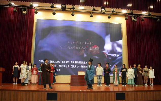6月2日中午,蒹葭读书社在大报告厅举行“国风雅聚,文古润今”蒹葭读书社风采展示暨百部经典主题演出活动。节目分为“天香引•上古韵典”“满庭芳•锦绣长卷”“清平乐•千秋鸿篇”三个篇章,内容围绕《诗经》、李白、苏轼、李清照等经典作品和文人展开,包含歌曲、舞蹈、原创诗朗诵、原创话剧、书法等不同表演形式。激活经典、熔古铸今。蒹葭读书社成员以喜闻乐见的方式推广典籍,为文化传承和保护贡献自己的青春力量。
