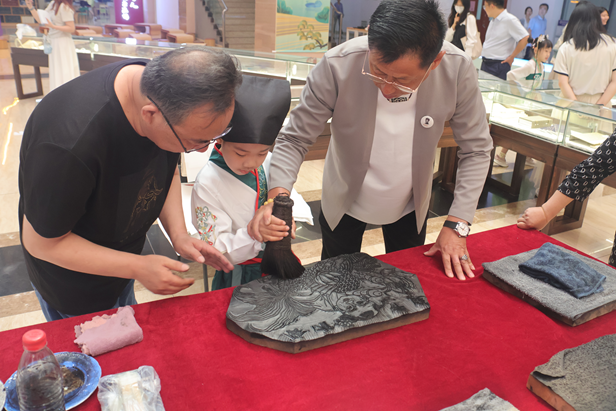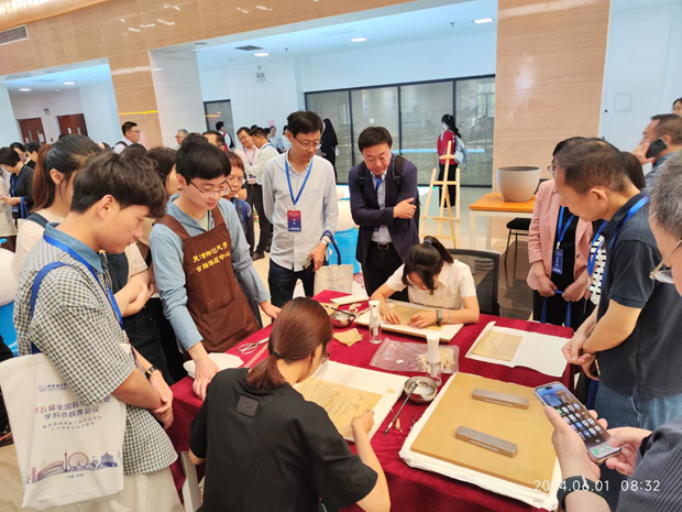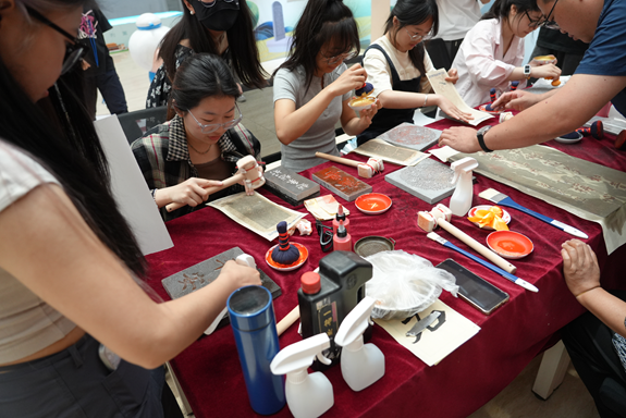 活动特邀了非遗传承人和古籍保护研究院的研究生为参观者现场讲解并演示金石传拓、雕版水印、古籍修复等非遗项目,来自校外众多专家、学者、同仁、中小学生及校内师生饶有兴致地体验了各项非遗技艺。