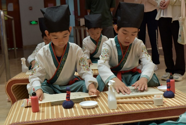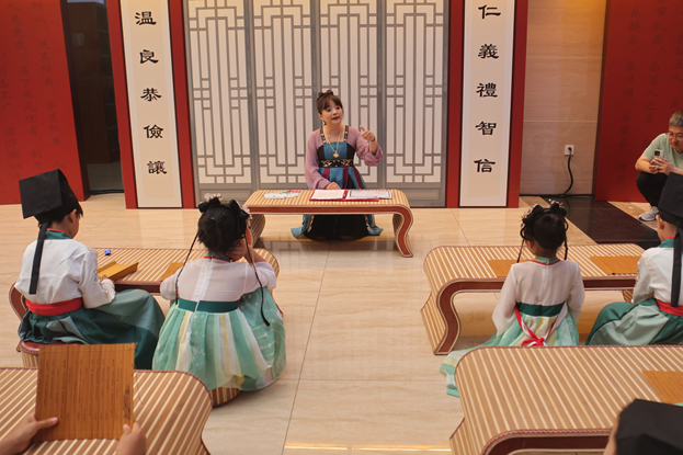 为积极推广中华优秀传统文化对少年儿童的教育和普及,在国际“六一”儿童节到来之际,图书馆在A区一楼举办“传承百部经典,国学浸润童心”亲子活动,邀请我校17组教师亲子家庭参加,活动由天津广播电视台教育频道节目主持人王楠主持。图书馆别出心裁地将古代私塾的场景“搬进”馆内,旨在模拟古代老师上课的情形,打造基于场景的沉浸式阅读环境。参加亲子活动的孩子们身着汉服走进“私塾”,在主持人王楠的带领下坐在案几旁诵读《论语》经典片段,听主持人讲述孔子的故事,体验古典非遗技艺。