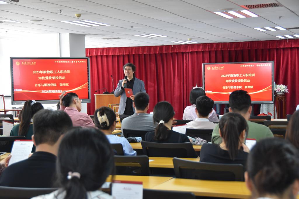 党委教师工作部消息(通讯员 孙智慧)5月10日下午,我校“知校爱校传薪火 善作善成谱新篇 ”2023年新教职工入职培训知校爱校荣校活动在图书馆10楼会议室举行。校友管理服务中心主任杨琥进行校史宣讲,音乐与影视学院副教授、艺术实践部主任张增赋教唱校歌。2023年新入职教师、党委教师工作部全体工作人员及育德学社学生代表80余人参与本次活动。活动由党委教师工作部副部长刘晓蕾主持。