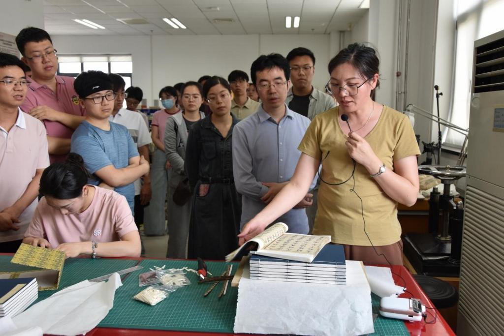 活动伊始,新入职教职工们怀着对知识的渴望和对历史的敬畏,踏入了古籍保护研究院。跟随付莉、牛甲芝、杨鹏三位老师的介绍,他们深入了解了我校古保院的发展历史,深刻感悟古籍保护事业在延续历史脉搏、传承中华优秀传统文化中所体现出的工匠精神。随后,校歌学唱环节将活动推向了高潮,张增赋老师以精湛的钢琴技艺和专业的领唱技巧,引领新教师们沉浸在厚重、激昂、振奋的校歌之中。大家热情洋溢,全身心投入,《桃李争妍》的旋律在图书馆上空悠扬回荡。