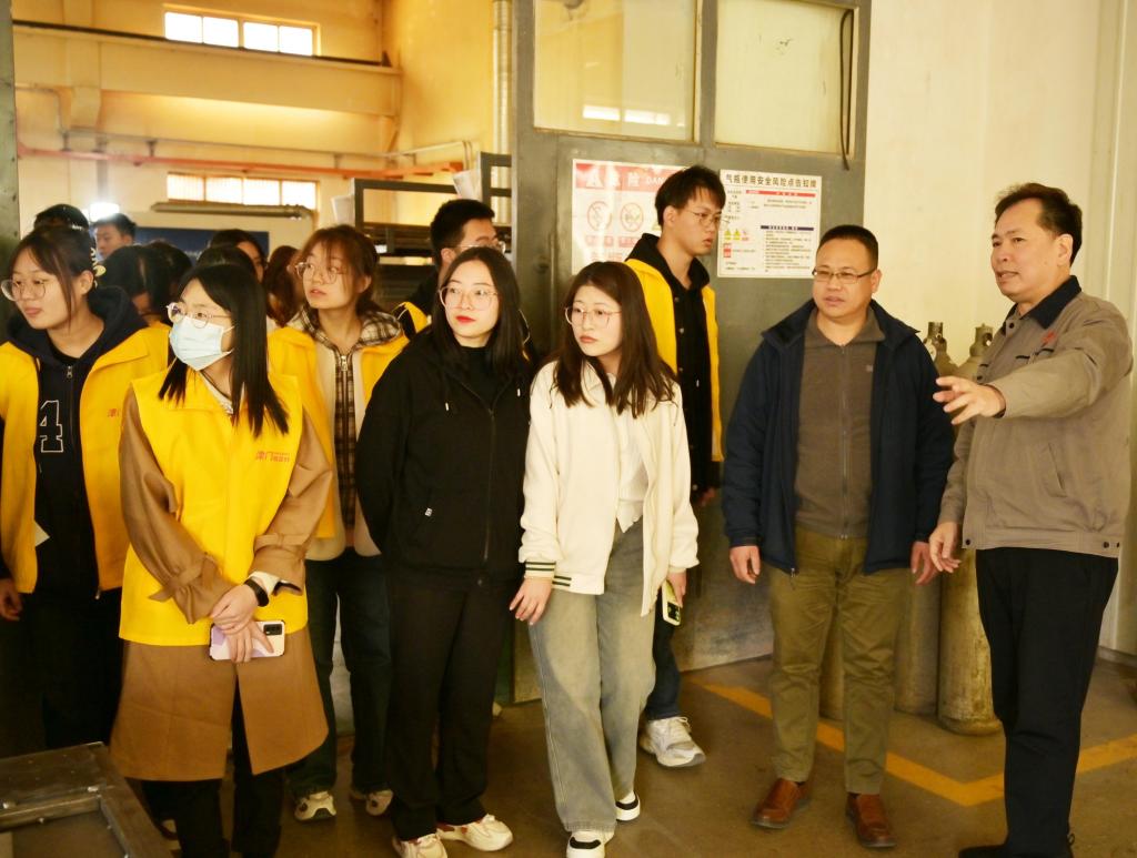 在天津中环电炉股份有限公司,公司总经理张文祥、市场部经理孙兰带领师生分别参观了钣金车间、装配车间以及研发中心,并现场演示了企业最新仪器设备。在座谈会上,公司负责人向同学们介绍了企业情况和岗位需求情况,由公司员工分享自己的求职和工作经历。