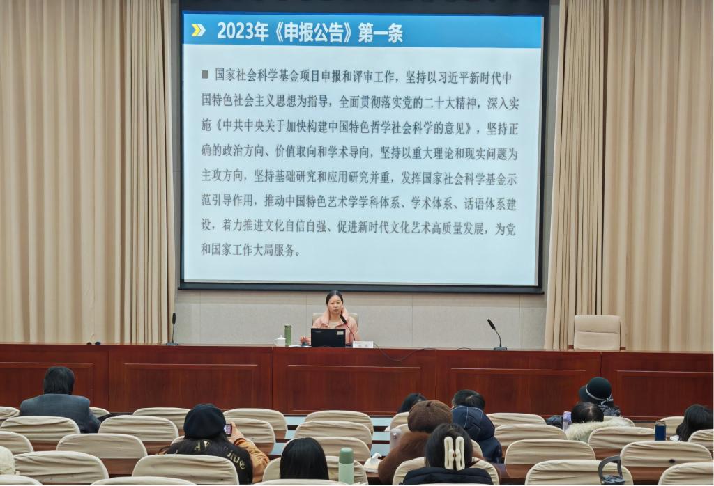 天津工业大学人文学院教授周丹分享了全国艺术规划课题的申报经验。她结合个人申报成果,围绕精准定位全国艺术规划选题、课题切入点、学界热点、研究价值、研究创新、申报书论证、申报书质量等方面,对全国艺术规划的申报要点进行了详细指导,并提出一系列建设性指导意见。周丹表示,申报书的填写必须严谨认真,申报人对每个部分都要仔细斟酌和思考,要早做准备、勤于交流、持续打磨、久久为功。