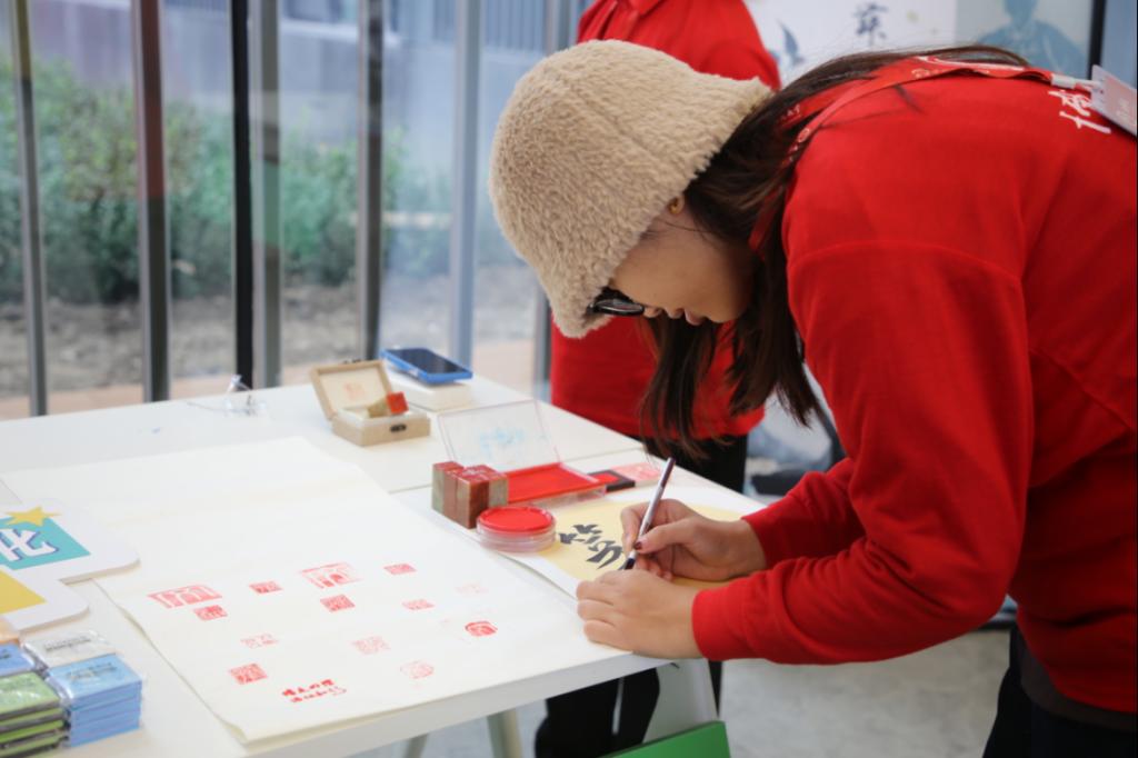 揭牌仪式结束后,在场师生跟随文学院中华优秀传统文化宣讲员参观了“擎信仰之炬 扬理想之帆”学生书法展,沉浸式体验了“文海拾贝”文化市集。文化市集开设8个文化体验展位,内容分别为:飞花令体验(数)、京剧脸谱体验(御)、书法创作体验(书)、石榴籽民族服饰体验(礼)、投壶体验(射)、民乐古典舞体验(乐)、篆刻体验、剪纸体验,将“君子六艺”巧妙融入其中。打破时间和地域限制的体验活动,让学生们真正直接地体会到中华优秀传统文化的魅力所在。