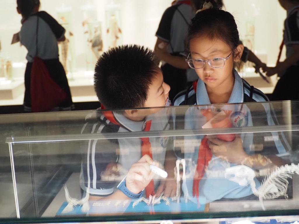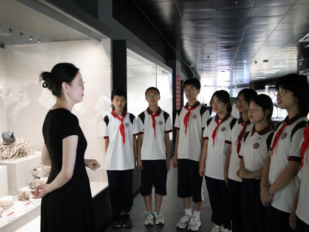 义兴里小学张馨匀老师带领学生走进标本的世界,她讲述了“海洋守护者”藻类植物的生态价值、昆虫世界的“生存游戏”、“四不像”麋鹿的“回家路”。展馆里“重生”的标本让学生们深刻明白生态保护的重要意义,“我们应该像守护国宝一样守护动物,就像战士守护祖国的土地一样!”同学们的话语里,饱含着对生态守护的深深敬意,蕴藏着“生态小卫士”的责任与担当。