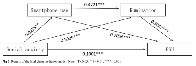 在最后的模型中,智能手机的使用和反刍在社交焦虑和PSU关系中发挥了一系列中介作用。研究结果对预防PSU具有启示意义,未来的研究应该集中在反刍及其与智能手机使用,可以继续对智能手机问题发展的潜在机制进行深入研究。