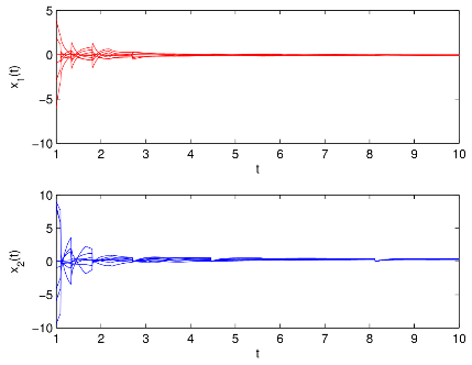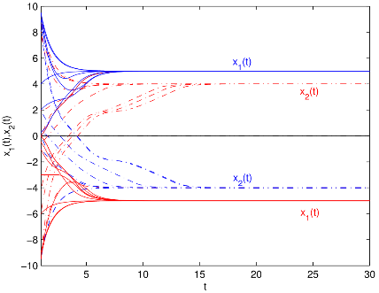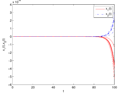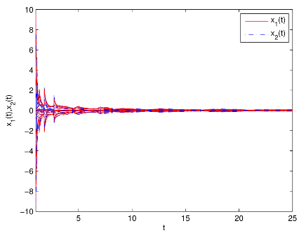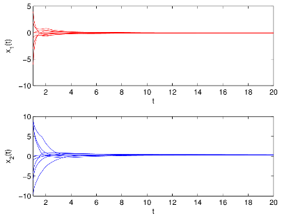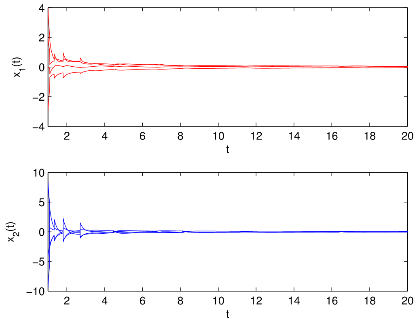 脉冲神经网络的镇定在优化问题中有着广泛的应用。由于网络运行过程中放大器的开关和信号传输导致时滞不可避免。比例时滞是一类无界时变时滞,双向比例时滞可更好的刻画神经网络的时滞情况,但是比例时滞的无界性给神经网络镇定研究带来了很大的挑战。传统的构造Lyapunov泛函的方法不容易解决向量形式的双向比例时滞脉冲神经网络(BPDINNs)的镇定问题。为了克服这一困难,周立群教授及其研究团队通过设计易于硬件实现的反馈控制器,并利用M-矩阵的性质构造了一个新的向量形式的时滞微分不等式。利用提出的时滞微分不等式、M-锥和M-矩阵的性质以及矩阵谱半径理论,证明了闭环系统平衡点存在且是唯一。进而得到了所研究的BPDINNs的全局多项式镇定准则,易于验证。该方法的创新性和优点是没有使用通常的构造Lyapunov泛函的研究方法,为双向比例时滞脉冲神经网络的动力学研究提供了新的研究方法及思路。数值仿真如图1所示。