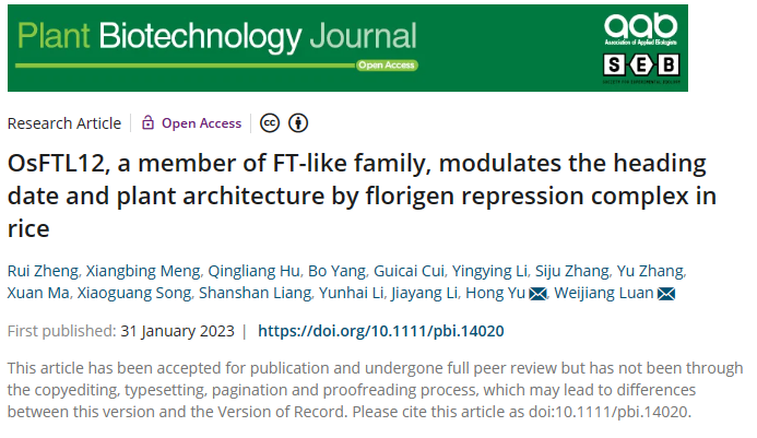 近日,生命科学学院栾维江教授团队和中国科学院遗传与发育生物学研究所李家洋院士团队开展合作研究,发现水稻FT-like家族成员OsFTL12在水稻抽穗开花及株型建成中的重要作用,为水稻的分子设计育种及品种改良提供了基因储备和材料基础。131日,Plant Biotechnology JournalArticle形式在线发表了这一研究成果。
