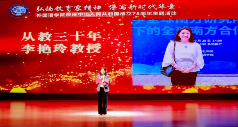 在“弘扬教育家精神 —— 纪念王嘉龄先生诞辰九十周年”主题活动中,她以三十年的从教经历和师生共同回顾王嘉龄先生等前辈“大先生”的育人故事,提炼其深耕教育、为国育才的精神内核。在教学中,她将这些“大先生”的教育理念转化为生动的课堂案例,让学生在具象化的故事中感悟教育家精神的时代内涵,引导学生在专业学习中向“大先生”看齐,把传承教育家精神融入日常,理解外语教育与国家发展的紧密联系。